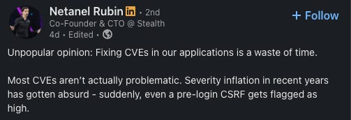 My frustration isn’t with any one post or issue, but with the pattern. We discuss security problems in isolation, without enough context or nuance. It’s easier that way, but it's also a trap. We end up treating every issue as urgent and worth fixing, which leads to bloated roadmaps, unclear priorities, and security teams that lose credibility with the business. I’ve talked about this issue before, where it seems like there’s so much activity in security with new tools and awareness, but why don’t things feel like they are getting better?